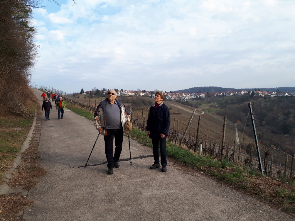Bei herrlichem frühlingshaften Wetter machten sich 24 Wanderer einschl. 3 Gästen auf den Weg von Buoch nach Winnenden. Von der Waldschänke in Buoch ging es über den Rossberg, vorbei an Breuningsweiler, Richtung Haselstein. Bei einer Rast dort genoss man die wunderschöne Aussicht auf Winnenden bis hin zum Lemberg. Weiter wanderten wir bergab durch die Weinberge bis nach Winnenden. In der Schwabenalm ließen wir diese sehr schöne Wanderung gemütlich ausklingen. Bus und Bahn brachte alle Beteiligten dann zurück nach Hohenacker. Vielen Dank an die Wanderführer Hans Jürgen Gendig und Hermann Faas.