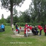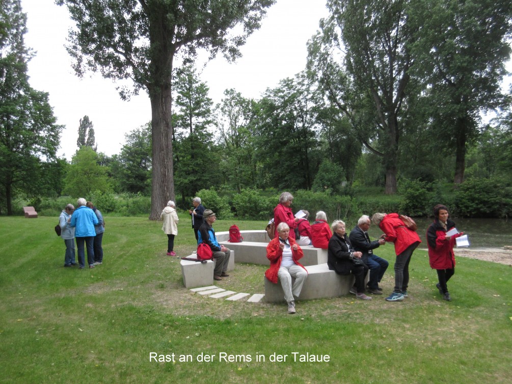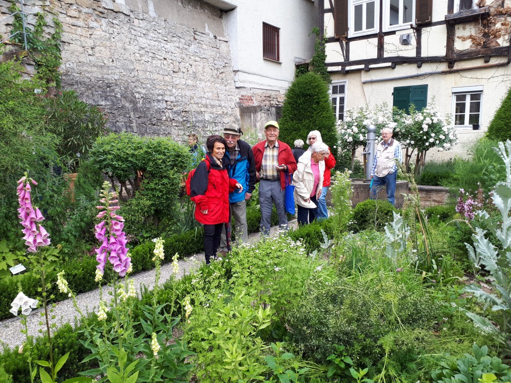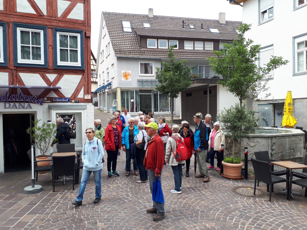 27 Wandersleute machten sich am Nachmittag auf den Weg, um Waiblingen zu erkunden. Am ältesten Haus vorbei zur schönen Altstadt spazierten wir über den Pfarr- und Apothekergarten zum Rems-Kulturweg, wo wir einen Blick auf den Talauesee mit seinen Seerosen werfen konnten. Über die Erleninsel mit der Ausstellung vieler bunter Zwerge ging es durch den Mauergang zum Biergarten, wo wir es uns gut gehen ließen. Auf dem Rückweg zum Parkplatz bestaunten wir noch den Mann auf dem Seepferdchen in der Rems und das weiße Haus.