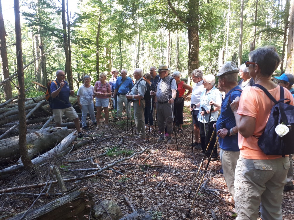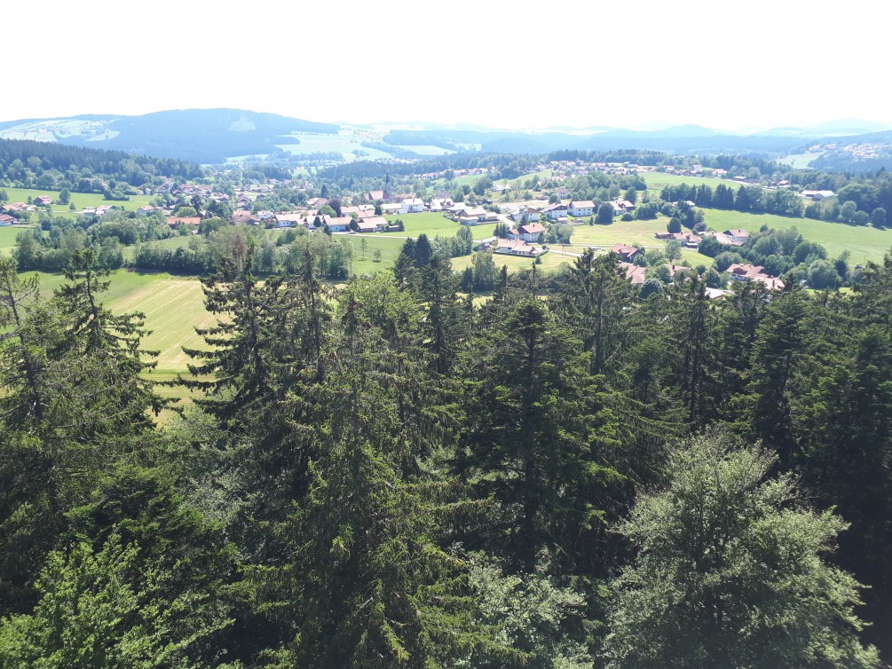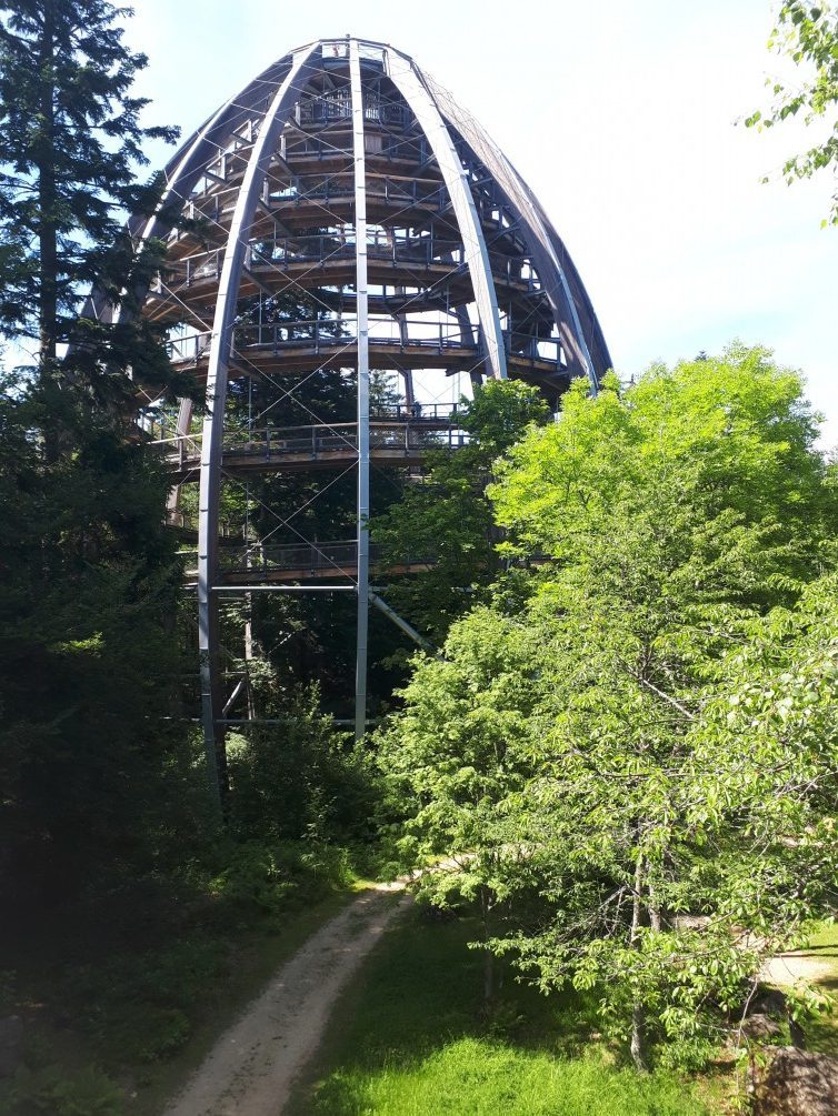 Am nächsten Tag, nach einem guten Frühstück, starteten wir mit dem „Igelbus“ zu unserer Wanderung im Nationalpark mit Endziel Baumwipfelpfad. Da für diesen Tag eine Temperatur von über 30 Grad angesagt war, teilten wir uns in zwei Gruppen für eine kleinere und eine größere Wanderung. Ziel war dann die Racheldiensthütte, wo eine gemeinsame Mittagseinkehr erfolgte. Die Wanderung durch den Nationalpark war wunderbar. Die Wanderführer erklärten uns, dass dies der älteste Nationalpark (50 Jahre) in Deutschland ist und sehr stark vom Borkenkäfer befallen ist. Da der Wald bisher nur aus Tannen- bzw. Fichtenholz besteht, wird es in Zukunft wohl eher einen Mischwald geben. Nach dem Mittagessen fuhren wir dann weiter zum Baumwipfelpfad. Die Aussicht vom „Baumwipfelturm“ war faszinierend. Eine wunderschöne Landschaft. Wir genossen die Ausblicke von diesem 44m hohen Turm.