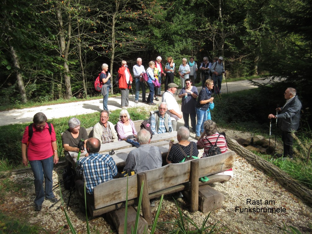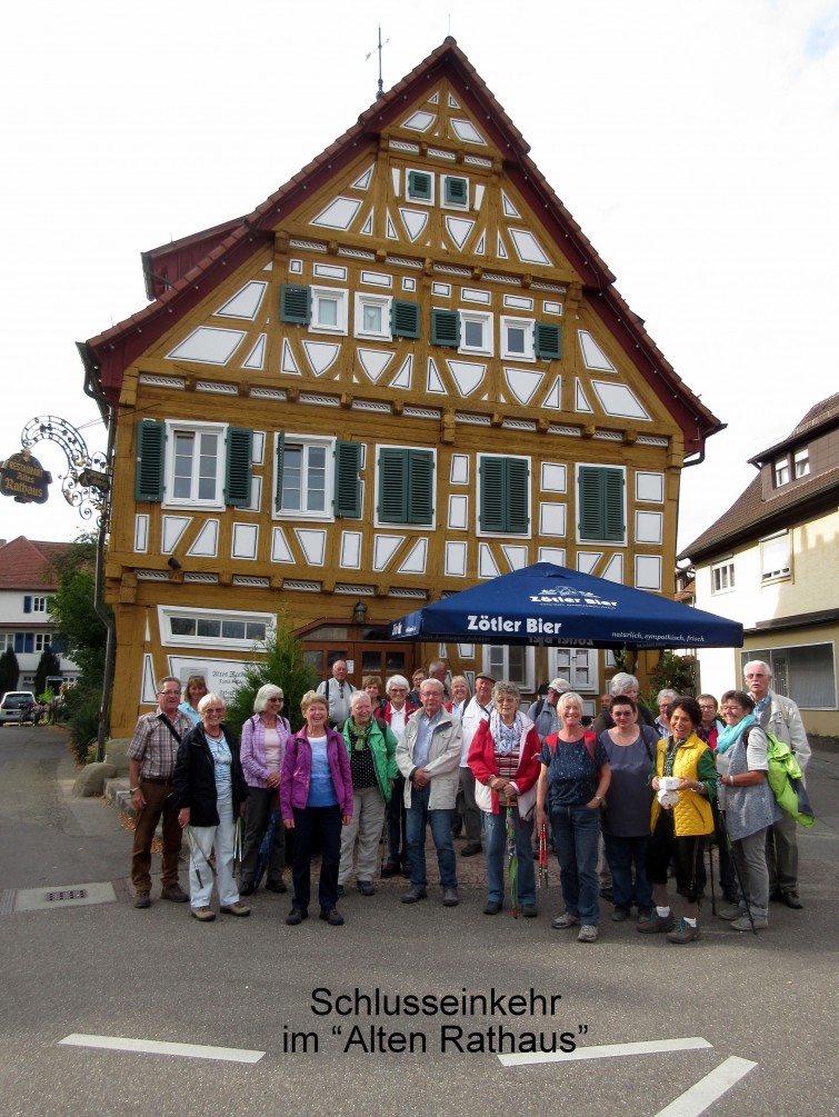Am Sonntag den 22. September um 08:45 trafen sich 27 gut aufgelegte Wanderer bei schönstem Wetter, um den Hochzeitsturm in Plüderhausen zu besteigen. Wir fuhren mit der Bahn, was auch diesmal hervorragend klappte. In Plüderhausen stand auch schon ein Taxi bereit, da der Aufstieg für Einige doch etwas zu anstrengend gewesen wäre. Am Hochzeitsturm fanden alle sich wieder. Nachdem wir die schöne Aussicht genossen, einige Bilder gemacht und noch ein Lied gesungen hatten, ging es über die Hochzeitswiese zur ersten Rast am Kelterparkplatz. Dort konnte sich jeder erst mal stärken, auch mit Prozenten, bevor das eigentliche Ziel „Funks Brünnele Weg“ Wanderung losging. Allerdings mussten wir achtgeben, da auf einem Teil der Strecke auch ein Radrennen stattfand. Beim Brünnele haben sich Einige mit Quellwasser erfrischt. Weiter ging es über den Nägeleswiesensee zum Himmelsteich. Danach haben wir den Rundwanderweg verlassen und gingen an der Tierpension Erlenhof vorbei nach Waldhausen. Da wir nicht sicher waren, wie unser Gesang auf Fremde wirkt, haben wir noch einige Lieder gesungen, bevor wir in Waldhausen einmarschierten. Da die Wanderung doch etwas anstrengend war, gingen nicht mehr alle zum Remsmittelpunkt mit. Sie warteten lieber am Bahnhof, von wo aus wir später nach Plüderhausen ins Restaurant fuhren. Ich glaube, alle waren froh endlich im Restaurant angekommen zu sein. Im Restaurant „Altes Rathaus“ waren schon Plätze reserviert. Die Speisen und Getränke waren sehr gut. Nach zwei Stunden ging es zwecks Heimfahrt zum Bahnhof. Auch die Heimfahrt mit der Bahn verlief reibungslos.